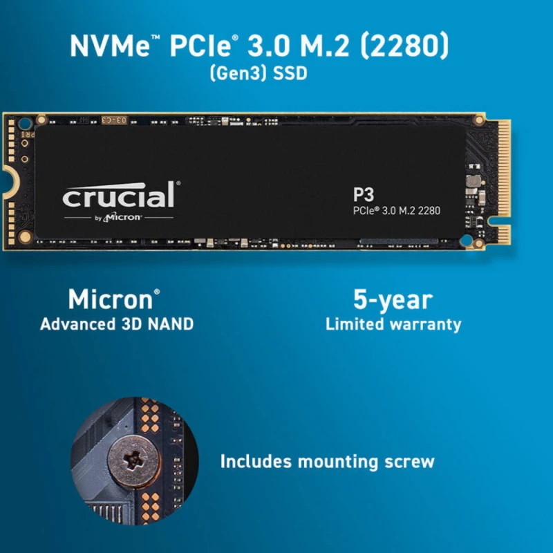 Crucial P3 1TB PCIe NVMe M.2 2280 internal SSD delivers high-speed storage with up to 3500 MB/s sequential read and 3000 MB/s sequential write speeds. Designed for desktops and laptops, this SSD offers fast data transfer, improved system responsiveness, and reliable performance for gaming, content creation, and everyday computing.