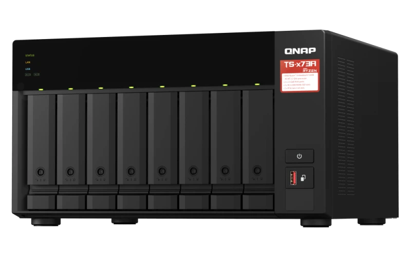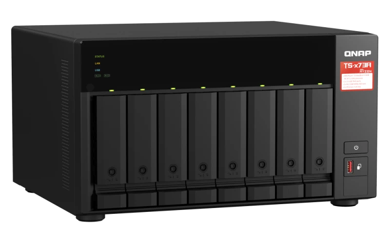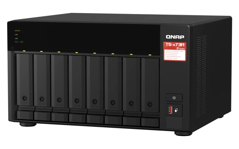 Featuring an AMD Ryzen™ V1000 series V1500B quad-core processor that delivers great system performance with up to quad-core / 8 threads and Turbo Core up to 2.2 GHz. The TS-873A features two 2.5GbE RJ45 ports and two PCIe Gen 3 slots for you to flexibly deploy 5GbE/10GbE networks. Two M.2 NVMe SSD slots for Qtier Technology and SSD Caching enable constant storage optimization. The TS-873A supports QTS and QuTS hero, allowing users to flexibly switch operating system based on their requirements.