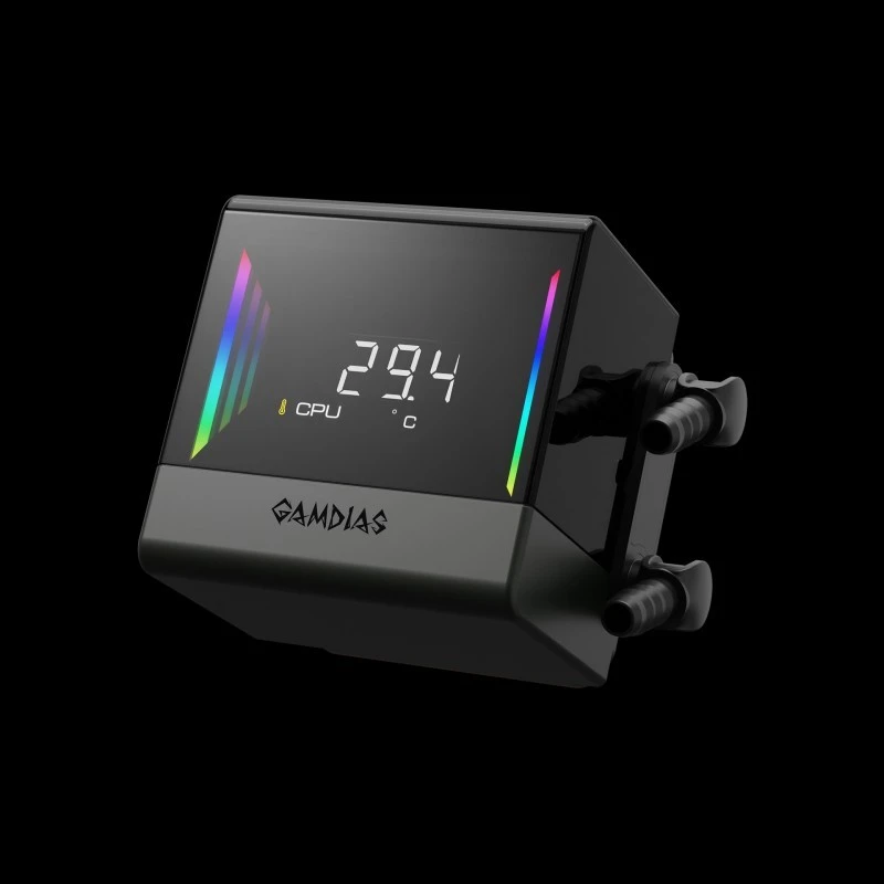 GAMDIAS CHIONE E4-240 is a high-performance 240mm liquid CPU cooler designed to deliver exceptional thermal efficiency and modern aesthetics. It features dual infinite mirror ARGB lighting for stunning visual depth and a real-time digital display that monitors system performance in real time. With an upgraded fluid system and copper base, it ensures faster heat transfer and stable cooling even under heavy loads. Compatible with Intel and AMD sockets, it combines silent operation, smart monitoring, and brilliant lighting for the perfect cooling solution.