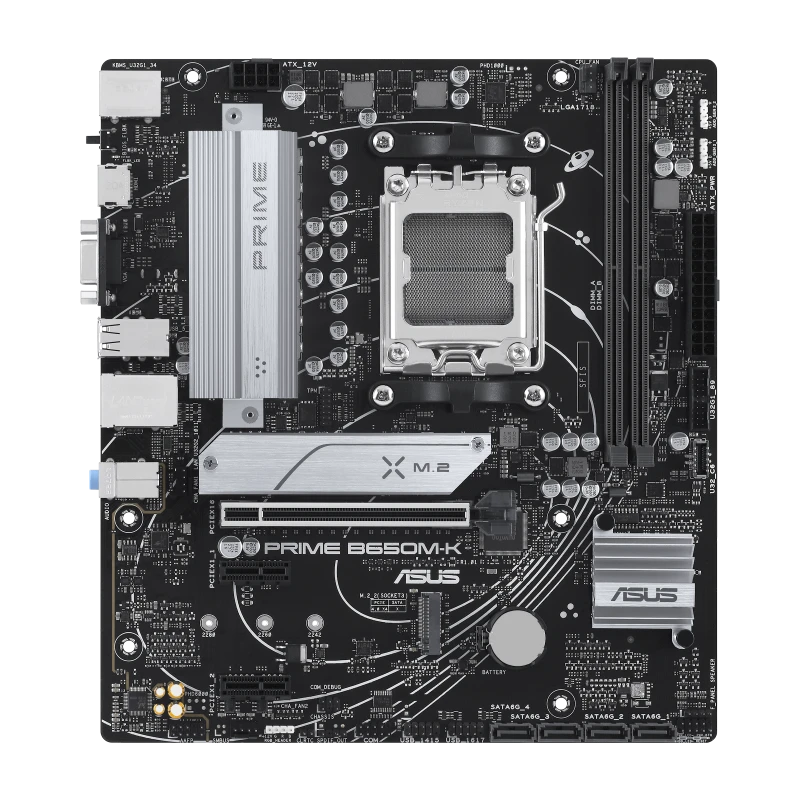 AMD B650 Micro-ATX motherboard with DDR5, PCIe 5.0 M.2, 2.5Gb Ethernet, HDMI™, VGA, rear USB 3.2 Gen 2, front USB 3.2 Gen 1 Type-C®, BIOS FlashBack™, Aura Sync