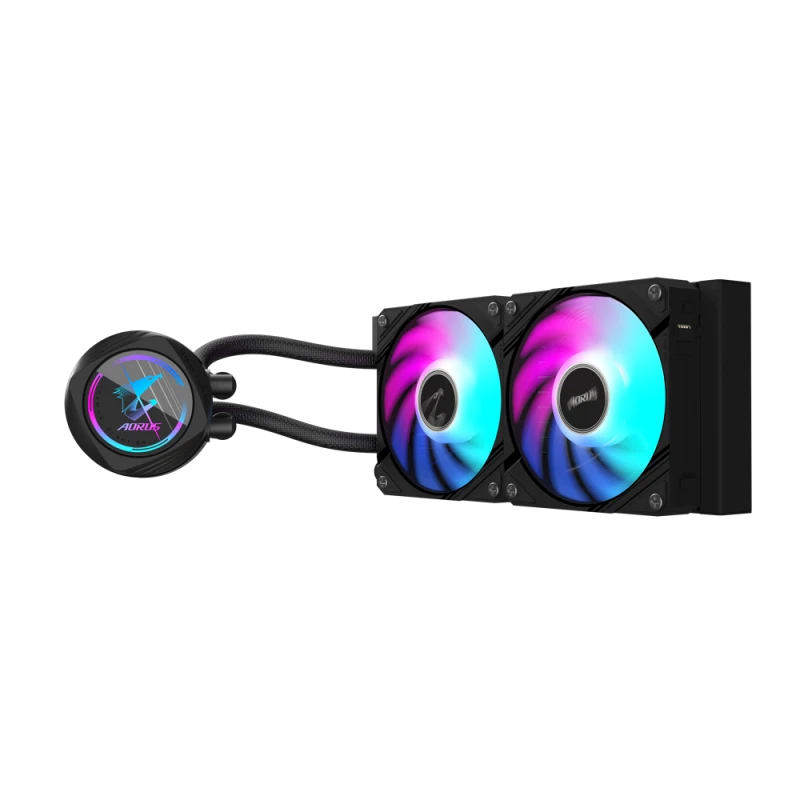 Brand: Gigabyte AORUS Model: WATERFORCE II 240 MPN: GP-AORUS WATERFORCE II 240 Radiator Dimensions: 277 × 119 × 27 mm (Aluminum) Fans: 2 × 120 mm ARGB, Hydraulic Bearing Fan Speed: 800 – 2300 RPM ±10% Fan Airflow: 64.95 CFM Fan Noise Level: 12.8 – 36.9 dBA Fan Pressure: 2.93 mm H₂O Pump Speed: 1600 – 3400 RPM ±10% Block Dimensions: 72.8 × 72.8 × 65.1 mm Cold Plate: Copper Block Rotation: 330° Rotatable Display Tubing Length: 380 mm, sleeved Socket Compatibility: