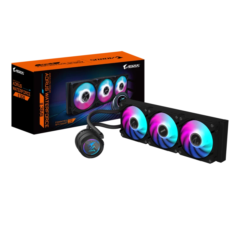Brand: Gigabyte AORUS MPN: GP-AORUS WATERFORCE II 360 GTIN: 4719331554002 Radiator: 394 × 119 × 27 mm (aluminum) Fans: 3 × 120 mm ARGB HDB, 800–2300 RPM, 64.95 CFM, 2.93 mm H₂O, 12.8–36.9 dB(A) Pump/Block: 72.8 × 72.8 × 65.1 mm, copper cold plate, 1600–3400 RPM, 330° rotatable block Tubing: 380 mm rubber with nylon sleeve Socket Support: Intel LGA115x, 1200, 1700, 1851; AMD AM4, AM5 Features: Fan EZ‑Chain daisy‑chain, ARGB sync, graphene nano-lubricant fans Warranty: 1-Year |