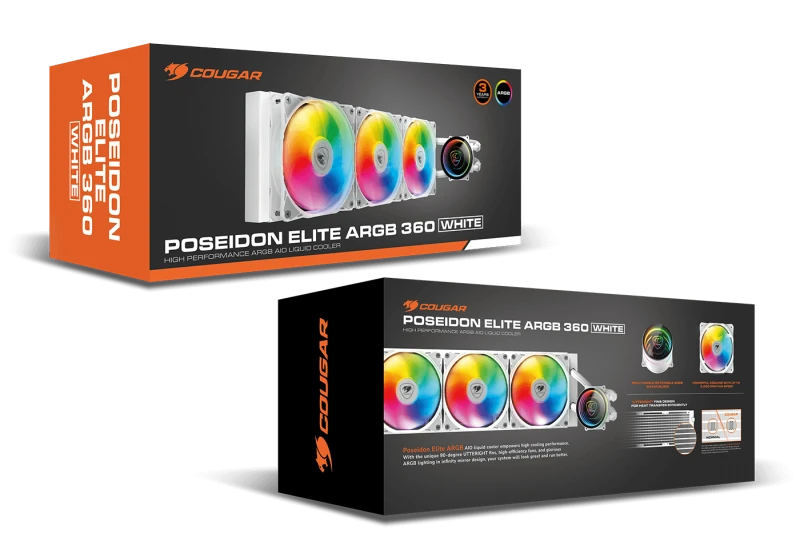 Cougar POSEIDON ELITE ARGB is a premium 360mm all-in-one liquid CPU cooler with a sleek white finish, featuring three 120mm PWM ARGB fans for high airflow and static pressure. Compatible with the latest AMD AM5 and Intel LGA1851 sockets, it delivers excellent thermal performance, quiet operation, and vibrant customizable lighting. Ideal for high-end gaming rigs and professional workstations in the UAE market.