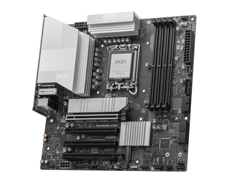 MSI PRO B860M-A Wi-Fi is a powerful Micro-ATX motherboard designed for Intel 14th/13th Gen processors with LGA 1851 socket. It supports up to 256GB DDR5 RAM, PCIe 5.0 x16 graphics slot, and three M.2 slots for ultra-fast NVMe storage. Features Thunderbolt 4, Wi-Fi 7, and 5G LAN for superior connectivity and performance in professional and gaming setups.