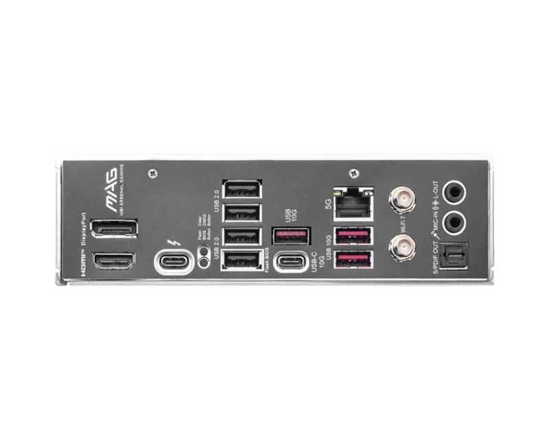 Chipset INTEL B860 CPU Supports Intel® Core™ Ultra Processors (Series 2) LGA 1851 Memory 4x DDR5 UDIMM, Maximum Memory Capacity 256GB Memory Support 9066 - 6400 (OC) MT/s / 6400 - 4800 (JEDEC) MT/s Max. overclocking frequency: • 1DPC 1R Max speed up to 9200+ MT/s • 1DPC 2R Max speed up to 7200+ MT/s • 2DPC 1R Max speed up to 6400+ MT/s • 2DPC 2R Max speed up to 5600+ MT/s Supports Intel® POR Speed and JEDEC Speed Supports Memory Overclocking and Intel® XMP 3.0 Supports Dual-Controller Dual-Channel mode Supports Non-ECC, Un-buffered memory Supports CUDIMM • The DIMM slots on this motherboard only have single-sided latches. • Memory compatibility and supported speeds can vary depending on the CPU and memory configuration. For detailed information, please refer to the Memory Compatibility List available on the product’s Support page or visit https://www.msi.com/support/. Onboard Graphics 1x HDMI™ Support HDMI™ 2.1 with FRL, maximum resolution of 8K 60Hz*/ ** 1x DisplayPort Support DisplayPort 1.4, maximum resolution of 4K 60Hz*/ ** 1x Type-C DisplayPort Thunderbolt™ 4 ports, supporting DisplayPort 2.1 with UHBR20 over USB Type-C, with a maximum resolution of 4K@120Hz / 8K@60Hz* *Available only on processors featuring integrated graphics. ** Graphics specifications may vary depending on the CPU installed. Slot 1x PCI-E x16 slot 1x PCI-E x4 slot PCI_E1 Gen PCIe 5.0 supports up to x16 (From CPU) PCI_E2 Gen PCIe 4.0 supports up to x4 (From Chipset) Audio Realtek® ALC897 Codec 7.1-Channel High Definition Audio Supports S/PDIF output Storage 3x M.2 M.2_1 Source (From CPU) supports up to PCIe 5.0 x4 , supports 2280/2260/2242 devices M.2_2 Source (From Chipset) supports up to PCIe 4.0 x4 , supports 2280/2260 devices M.2_3 Source (From Chipset) supports up to PCIe 4.0 x4 , supports 2280/2260 devices 4x SATA 6G **Please refer to the manual for M.2 SSD heatsink restrictions. RAID Supports RAID 0, RAID 1, RAID 5 and RAID 10 for SATA storage devices Onboard Thunderbolt Thunderbolt Resource CPU 1x Thunderbolt4 ports (Rear) Supports up to 40Gbps transfer rate with Thunderbolt devices Supports up to 20Gbps transfer rate with USB4 devices Supports up to 10Gbps transfer rate with USB 3.2 devices Supports up to 5V/3A,15W power charging Each port can daisy-chain up to three Thunderbolt 4 devices or five Thunderbolt 3 devices Supports up to 8K display USB 4x USB 2.0 (Rear) 4x USB 2.0 (Front) 2x USB 5Gbps Type A (Front) 3x USB 10Gbps Type A (Rear) 1x USB 10Gbps Type C (Rear) 1x USB 10Gbps Type C (Front) LAN Intel® Killer™ E5000 5Gbps LAN Internal IO 1x Thunderbolt5 card connector(JTBT5, support RTD3) 1x Power Connector(ATX_PWR) 2x Power Connector(CPU_PWR) 1x Power Connector(PCIE_PWR 8pin) 1x CPU Fan 1x Combo Fan (Pump_Sys Fan) 4x System Fan 1x EZ Conn-header (JAF_1) 2x Front Panel (JFP) 1x Chassis Intrusion (JCI) 1x Front Audio (JAUD) 1x Tuning Controller connector(JDASH) 3x Addressable V2 RGB LED connector (JARGB_V2) 1x RGB LED connector(JRGB) 1x TPM pin header(Support TPM 2.0) 4x USB 2.0 ports 2x USB 5Gbps Type A ports 1x USB 10Gbps Type C ports WIRELESS LAN & BLUETOOTH Intel® Killer™ BE1750x Wi-Fi 7 The Wireless module is pre-installed in the M.2 (Key-E) slot Supports MU-MIMO TX/RX, 2.4GHz / 5GHz / 6GHz* (320MHz) up to 5.8Gbps Supports 802.11 a/ b/ g/ n/ ac/ ax/ be Supports Bluetooth® 5.4**, MLO, 4KQAM * 6GHz band support may depend on every country’s regulations and Wi-Fi 7 will be ready in Windows 11 SV3. ** The Bluetooth version may be updated, please refer to the Wi-Fi chipset vendor's website for details. Bluetooth 5.4 support schedule depends on MSFT Windows 11 plan. LED FEATURE 4x EZ Debug LED 1x EZ Memory Detection LED |