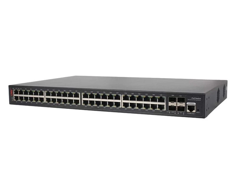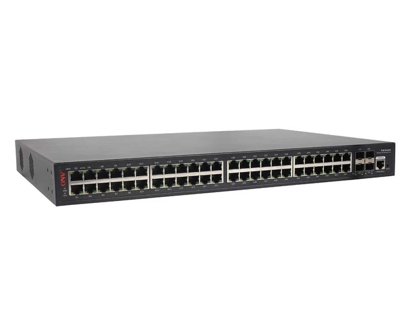 The ONV-POE33052PFM is a Gigabit managed PoE switch independently developed by ONV. It has 48*10/100/1000Base-T adaptive RJ45 ports and 4*100/1000Base-X uplink SFP fiber ports. Port 1-48 can support IEEE 802.3 af/at PoE standard and single-port PoE power up to 30W. As a PoE power supply device, it can automatically detect and identify powered devices that meet standards and power them through network cables. It can power PoE terminal equipment such as wireless AP, IP camera, Internet telephone, and building visual access control intercoms through network cables to meet network environments that require high-density PoE power supply. It is suitable for hotels, campuses, parks, supermarkets, scenic spots, factory dormitories, and small and medium-sized enterprises to establish cost-effective networks.