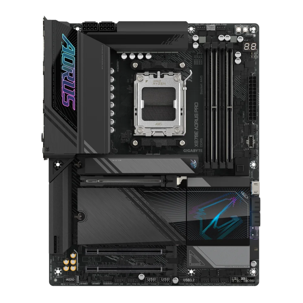 Gigabyte X870E AORUS PRO is a premium ATX motherboard for AMD Ryzen AM5 processors. It supports DDR5 memory, features four PCIe 5.0 M.2 slots for ultra-fast NVMe SSDs, dual USB-C ports with 40Gbps transfer speeds, next-gen Wi-Fi 7, and 2.5Gb Ethernet for reliable high-speed networking. Ideal for gamers and content creators demanding cutting-edge performance.