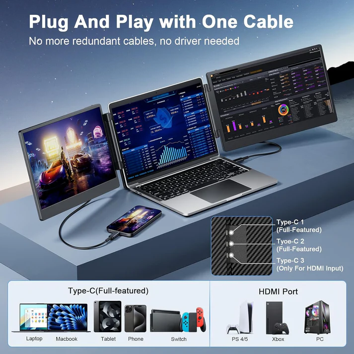 Easy Setup: Plug and play design with a single fully functional Type-C port. Requires two full-function USB-C ports or one USB-C port and one HDMI port. If your laptop lacks a Type-C with DisplayPort or if you're unsure about compatibility, contact us for a solution.