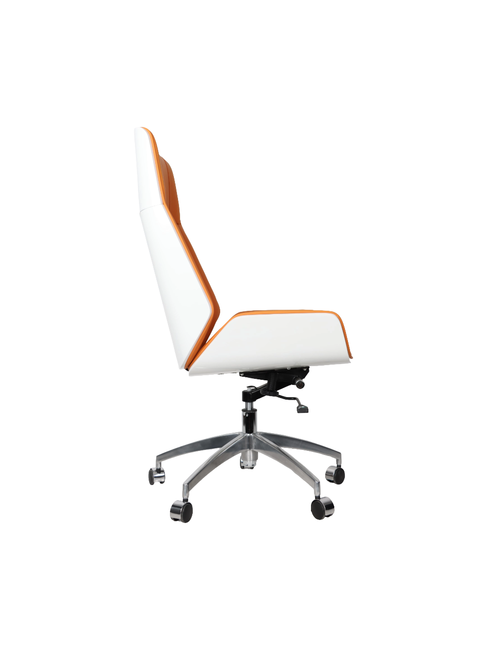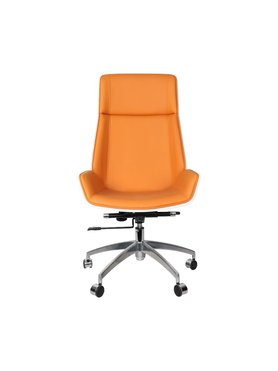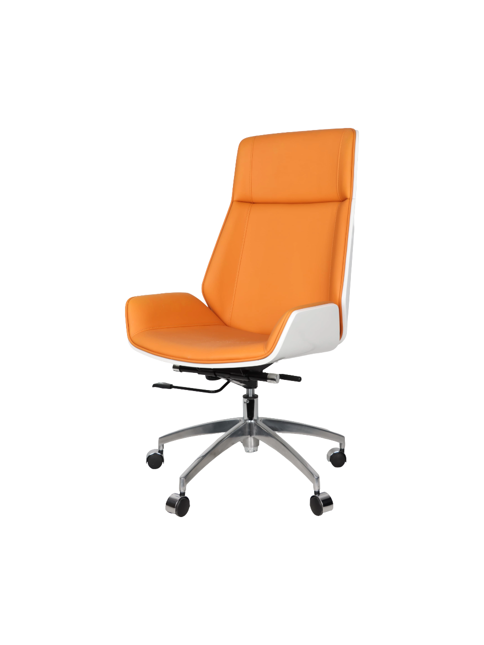 Feature Details Product Type Executive Chair / Lift Chair / Swivel Chair Material Synthetic Leather Design Style Modern Color Orange with White Back Shell Frame Material Metal Headrest Fixed Seat Cushion Ergonomic Contoured Padding Function Height Adjustable (Gas Lift) Movement Type 360° Swivel Base Type 5-Star Metal Base with Casters Tilting Function Yes (Tilt & Lock Mechanism) Ergonomic Support Yes Usage Office, Conference Room, Home Office |