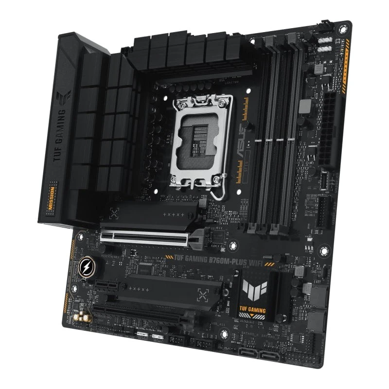 ASUS TUF GAMING B760M-PLUS WIFI is a reliable mATX motherboard for Intel 12th/13th Gen CPUs, featuring LGA1700 socket, DDR5 RAM support, PCIe 5.0 slot, dual M.2 slots for fast NVMe SSDs, integrated Wi-Fi 6, 2.5Gb Ethernet, and USB-C. Built for durability and stable performance in gaming and productivity builds.