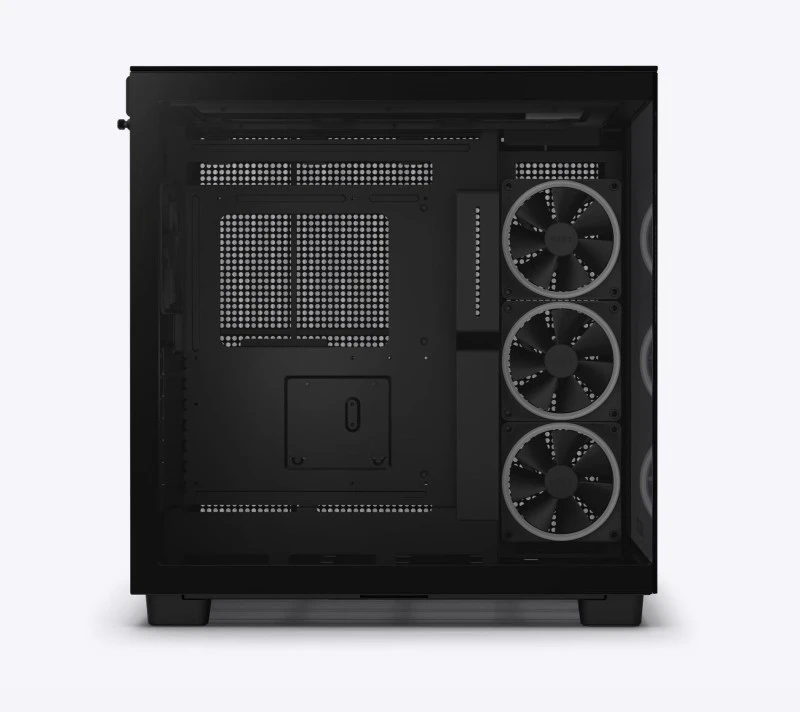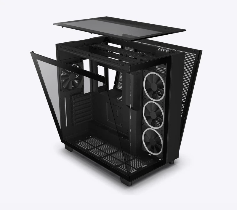 NZXT H9 Elite Premium Mid-Tower case in black features a dual-chamber design for superior airflow and tidy cable management. Equipped with tempered glass panels, customizable RGB lighting, and extensive liquid cooling support including up to 360mm radiators. Spacious interior supports ATX, Micro-ATX, Mini-ITX motherboards, multiple storage drives, ideal for gaming and enthusiast builds.