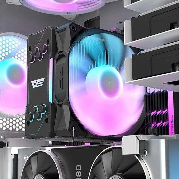 DarkFlash S11 Pro is a high-performance tower air cooler featuring a 120 mm PWM fan with speeds from 800–1800 RPM, engineered ARGB lighting, and four direct-contact copper heatpipes. Delivering 73.6 CFM airflow and 2.12 mm H₂O static pressure, it ensures efficient heat dissipation and quiet cooling (28 dBA). Compatible with modern Intel and AMD sockets, perfect for gaming and productivity builds