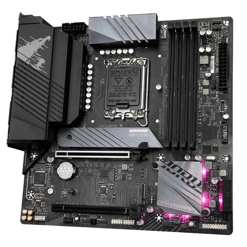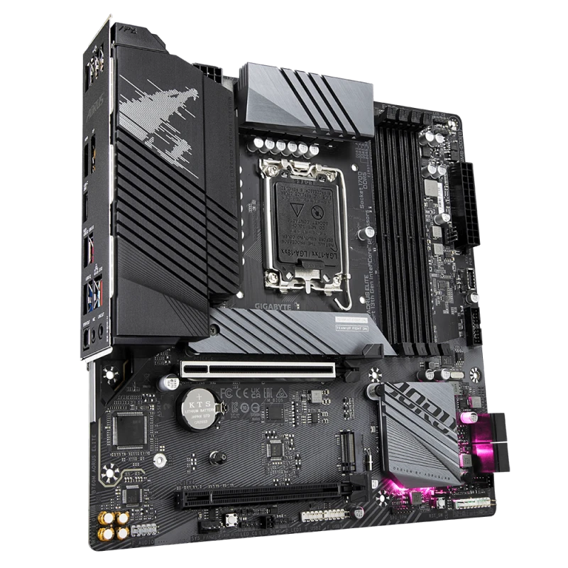 Premium GIGABYTE LGA 1700 DDR5 micro‑ATX motherboard, stable twin 12+1+1 digital VRM with 60 A DrMOS, support for DDR5 XMP 3.0 OC, dual PCIe 4.0 M.2 with Thermal Guard, Intel Wi‑Fi 6E & BT 5.3, Realtek 2.5GbE LAN, USB 3.2 Gen2x2 Type‑C, Q‑Flash Plus, EZ‑Latch PCIe/M.2 — ideal for compact UAE gaming rigs and creator builds.