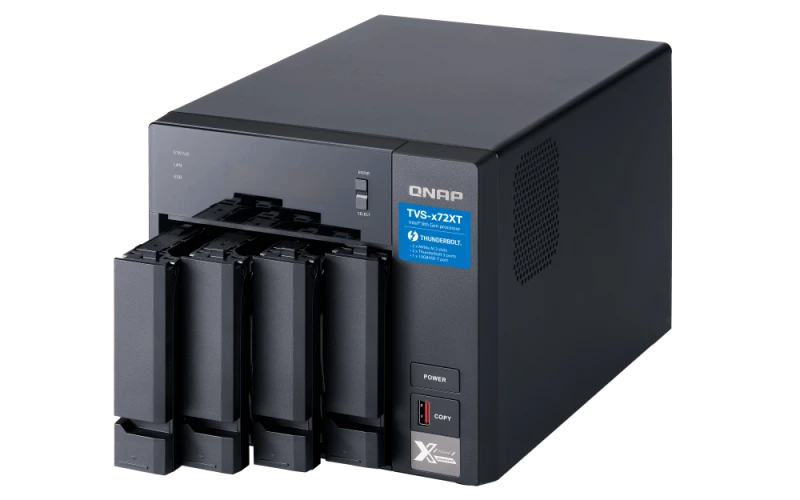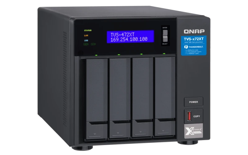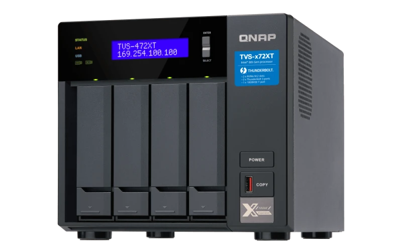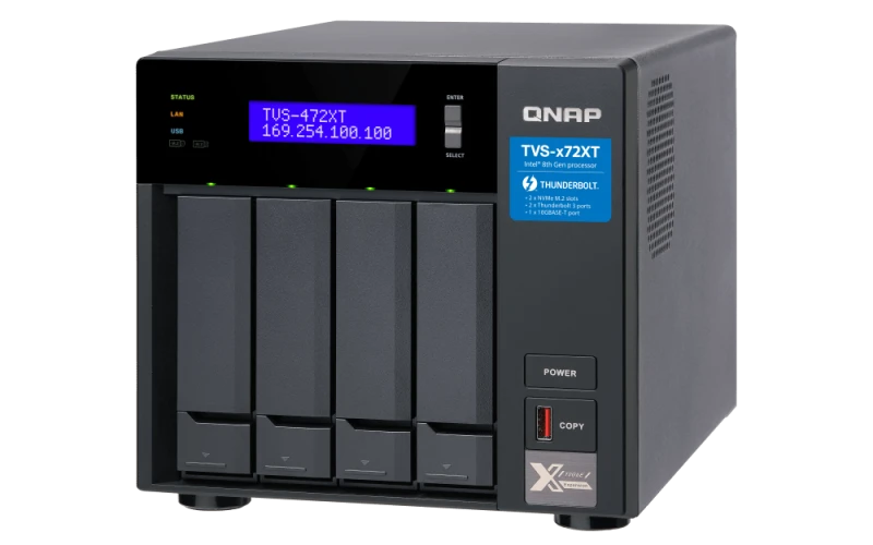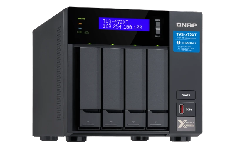 Powered by an 8th generation Intel® Pentium® Gold / Intel® Core™ i3/i5 processor, the high-performance TVS-472XT NAS features both 10GBASE-T and Thunderbolt™ 3 high-bandwidth connectivity for tackling heavy workloads and smoothly transferring, displaying and editing 4K videos in real-time. With M.2 SSD support and the ability to install a graphics card, the TVS-472XT provides the ability to boost performance and create a scalable working environment for collaboration and high-speed file sharing. The TVS-472XT is driven by high-quality hardware that delivers optimum performance, comprehensive multimedia features, expandable storage capacity, and numerous other NAS functionalities to inspire greater creativity and accomplishments!