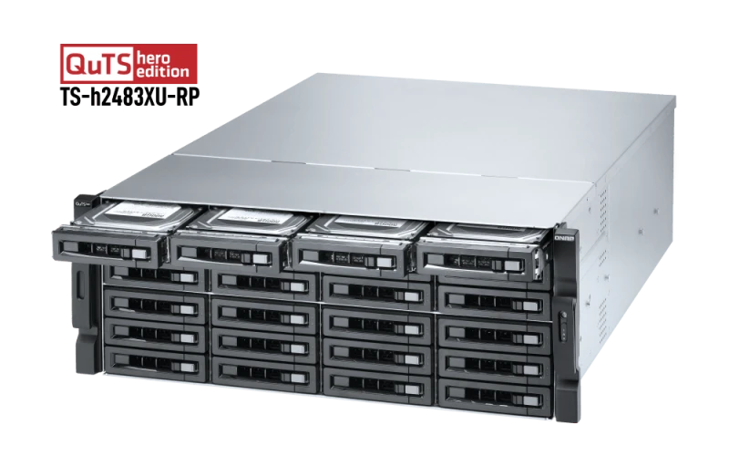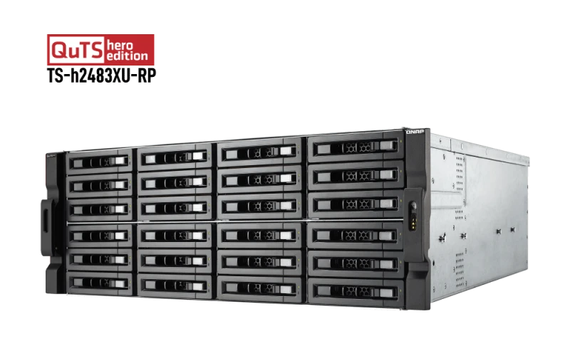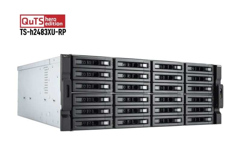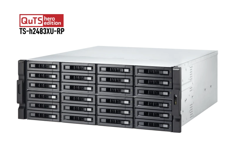 The QuTS hero NAS TS-h2483XU-RP is powered by an Intel® Xeon® E processor with up to 128 GB DDR4 Error Correcting Code (ECC) memory to deliver server-grade performance with dependable reliability. Running the ZFS-based QuTS hero operating system, the TS-h2483XU-RP supports near-limitless snapshots, real-time SnapSync, block-level inline data deduplication, and inline data compression. The TS-h2483XU-RP helps your business achieve reliable service-level agreement performance, whether as a mission-critical file server, virtualization server, VDI, collaborative video editing, or efficient file backup and recovery applications.
