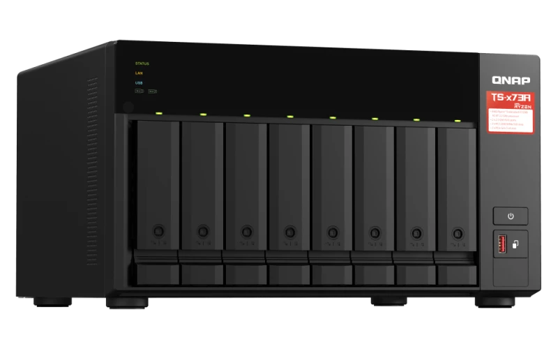 Featuring an AMD Ryzen™ V1000 series V1500B quad-core processor that delivers great system performance with up to quad-core / 8 threads and Turbo Core up to 2.2 GHz. The TS-873A features two 2.5GbE RJ45 ports and two PCIe Gen 3 slots for you to flexibly deploy 5GbE/10GbE networks. Two M.2 NVMe SSD slots for Qtier Technology and SSD Caching enable constant storage optimization. The TS-873A supports QTS and QuTS hero, allowing users to flexibly switch operating system based on their requirements.