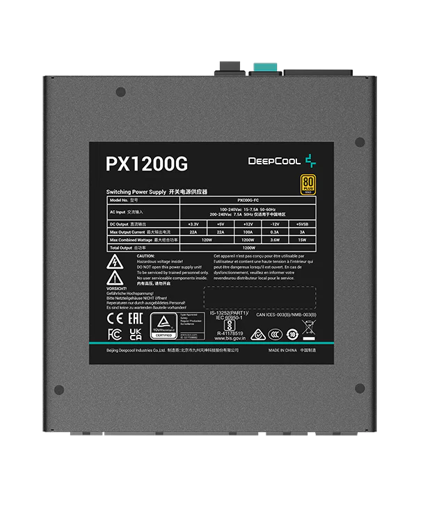 Deepcool PX1200G delivers stable 1200W power with 80 PLUS Gold and Cybenetics Gold efficiency certifications. Features Active PFC, Half Bridge SRC LLC topology, DC to DC design for improved voltage regulation and energy efficiency. Equipped with a silent 135mm FDB fan for optimal cooling and longevity. Durable black finish, supports high-performance PC builds with reliable power delivery and protection. Ideal choice for gamers and professionals in UAE.