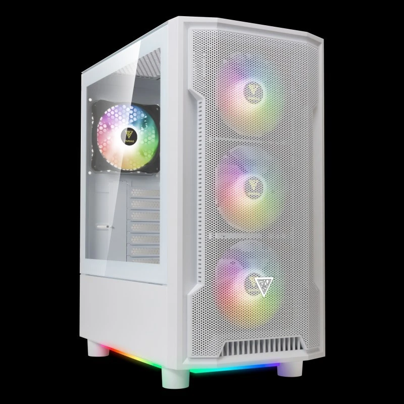 ATHENA M6 LITE WH is a mid-tower case with a unique lighting profile focused on optimizing airflow performance. The case features a panoramic mesh front panel, four built-in 120mm ARGB fans, and triple-sided ARGB light strips to leverage airflow performance and create ambient underglow lighting effects.