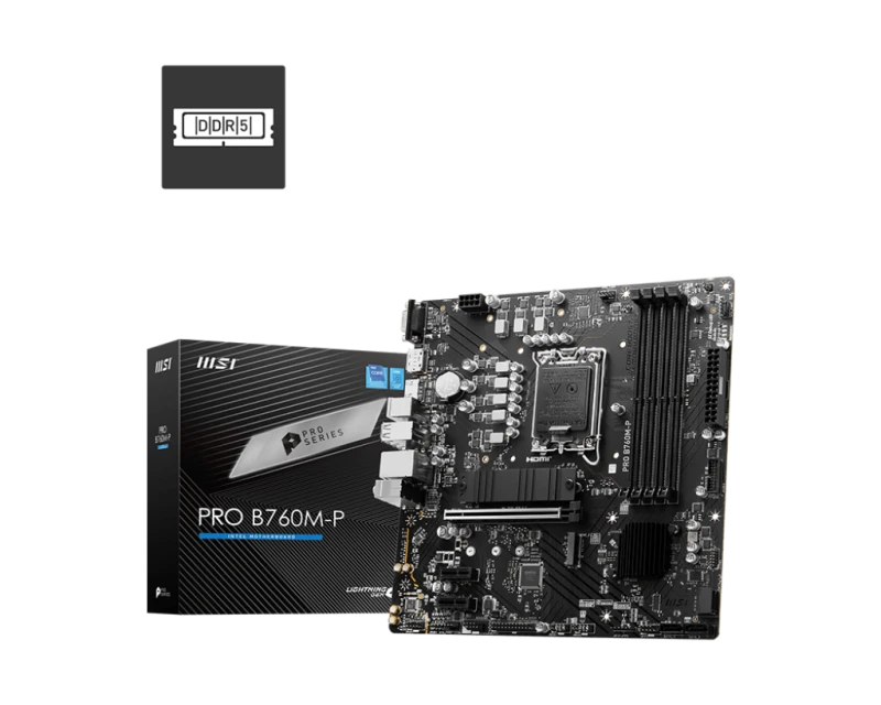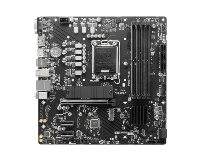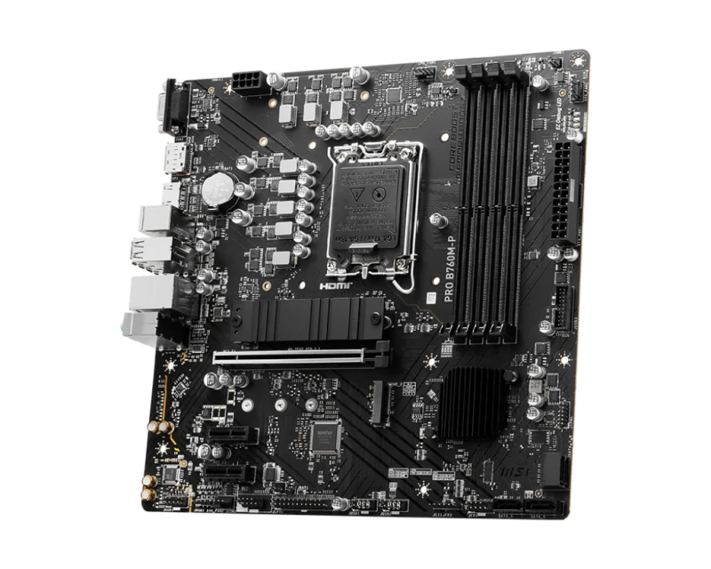MSI PRO B760M-P micro-ATX motherboard with Intel LGA 1700 socket, supports up to 256GB DDR5 memory, PCIe 4.0 x16 slot for graphics cards, integrated HDMI and VGA ports, and high-speed USB 3.2 connectivity. Perfect for efficient workstation and gaming setups.