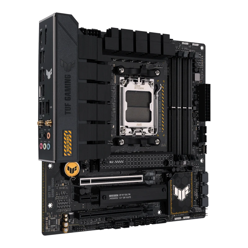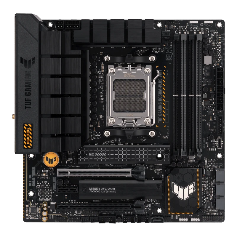 ASUS TUF GAMING B650M-PLUS WIFI takes all the essential elements of the latest AMD Ryzen 7000-series processors and combines them with game-ready features and proven durability. Engineered with military-grade components, an upgraded power solution and a comprehensive cooling system, this motherboard goes beyond expectations with rock-solid and stable performance for marathon gaming. TUF GAMING motherboards also undergo rigorous endurance testing to ensure that they can handle conditions where others may fail. Aesthetically, this model incorporates rugged off-black and geometric design elements to reflect the dependability and stability that defines the TUF GAMING series.