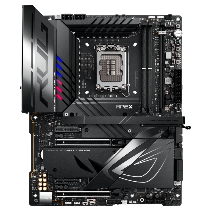 The ASUS ROG MAXIMUS Z790 APEX ENCORE is an elite ATX motherboard designed for Intel 14th & 13th Gen Core processors on the LGA1700 socket. With support for up to 96GB of DDR5 memory at blazing-fast 8400+ MT/s, it also features 5x M.2 slots for high-speed storage, PCIe 5.0 for next-gen GPUs, and Intel Wi-Fi 7 for ultra-fast wireless connectivity. Enhanced with USB4, robust power delivery, AI Overclocking, and thermal management, this board is optimized for extreme performance, overclocking, and enthusiast builds.
