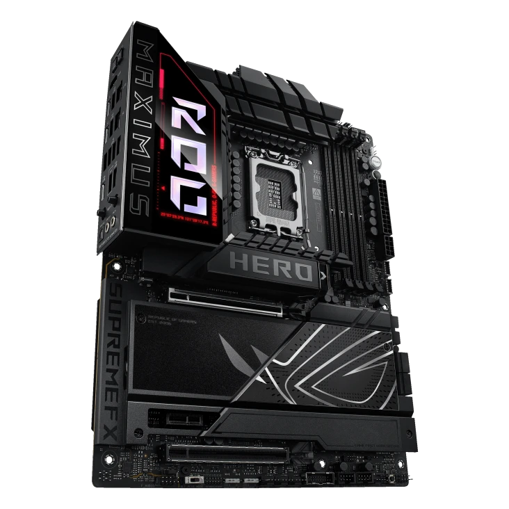 SUS ROG MAXIMUS Z890 HERO is a premium ATX motherboard for Intel LGA 1851 CPUs, offering DDR5 memory support up to 192GB at 9200+ MT/s for extreme performance. It features 6x M.2 Gen5 slots, PCIe 5.0 x16, Wi-Fi 7, USB4, and a reinforced power design for gamers and creators who demand speed, stability, and future-ready connectivity. Designed for elite builds and overclocking enthusiasts.