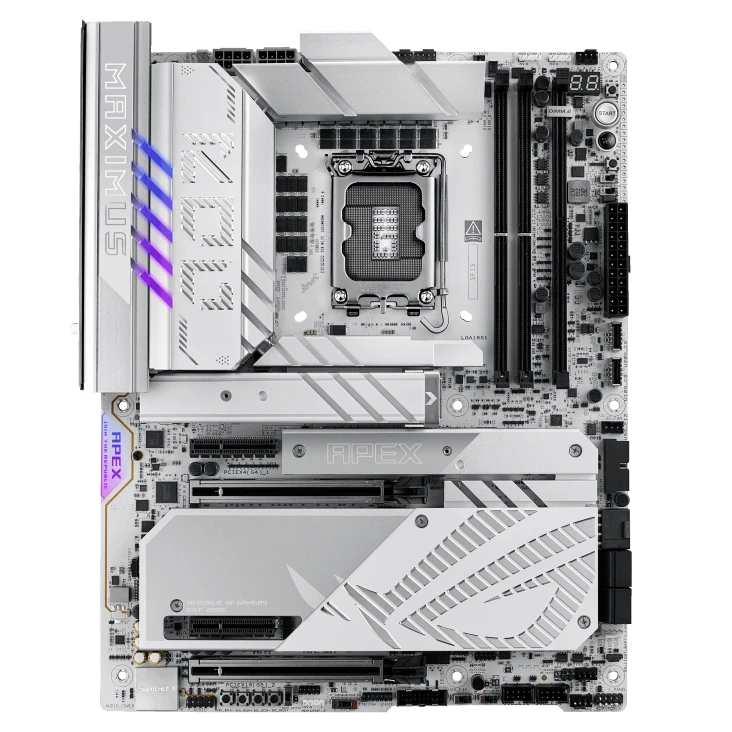 The ROG Maximus Z890 Apex fully supports Intel® Core™ Ultra processors (Series 2). Precision-engineered for supreme overclocking, it carries the legacy of the series forward into a new generation. With exceptional power delivery and a two-slot DDR5 memory layout, overclockers can meet and exceed their ambitions for record-breaking CPU and memory performance. For those who favor lighter colors for the aesthetics of their build, the ROG Maximus Z890 Apex features a cobble-gray surface, polished metallic accents, sleek contours and a predominantly silver palette.