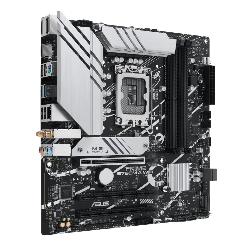 ASUS PRIME B760M-A WiFi mATX motherboard supports Intel B760 chipset with LGA 1700 socket, offering up to 192GB DDR5 memory and PCIe 4.0 x16 for high-speed graphics. Equipped with dual M.2 NVMe slots, Wi-Fi 6, and USB-C connectivity for fast data transfer. Perfect for reliable performance in gaming and professional builds.