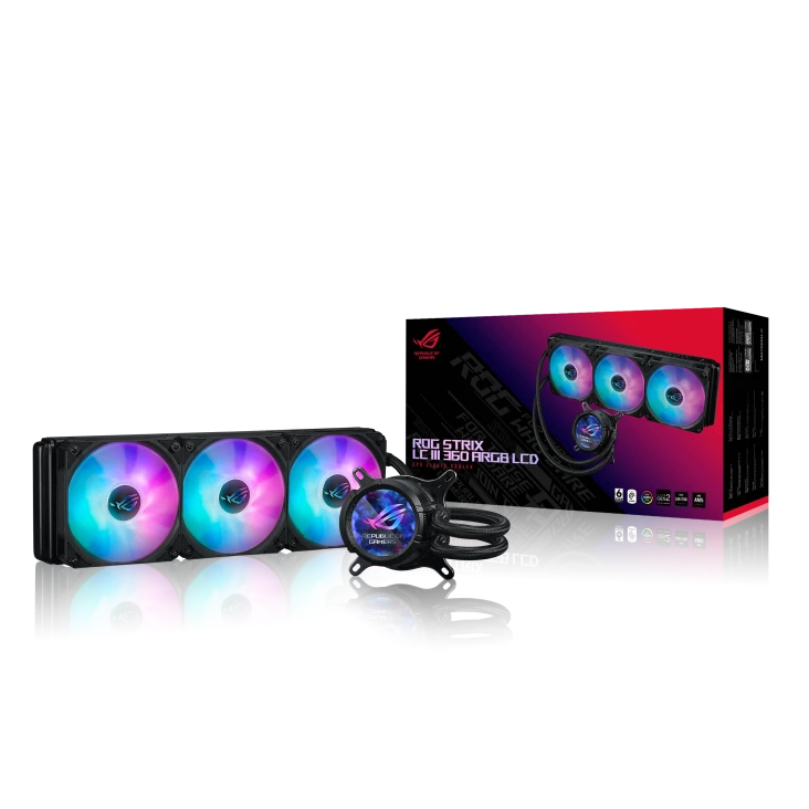 ASUS ROG STRIX LC III 360 ARGB LCD AIO cooler delivers exceptional cooling with a 360mm radiator, premium ARGB fans, 7th gen Asetek pump, and a vivid 3.5” LCD screen. Supports Intel & AMD platforms. Silent, efficient, stylish.