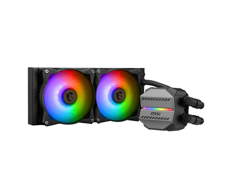 MSI MAG CORELIQUID M240 AIO liquid cooler with 240mm radiator, dual ARGB 120mm PWM fans for efficient, quiet cooling, customizable RGB lighting, and broad CPU socket compatibility. Perfect for gamers and PC enthusiasts seeking reliable thermal management.