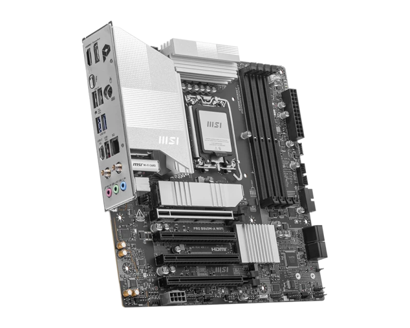 MSI PRO B860M-A Wi-Fi is a powerful Micro-ATX motherboard designed for Intel 14th/13th Gen processors with LGA 1851 socket. It supports up to 256GB DDR5 RAM, PCIe 5.0 x16 graphics slot, and three M.2 slots for ultra-fast NVMe storage. Features Thunderbolt 4, Wi-Fi 7, and 5G LAN for superior connectivity and performance in professional and gaming setups.