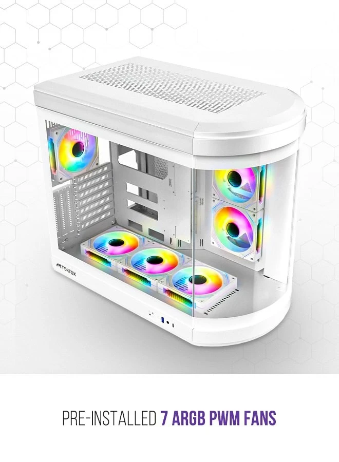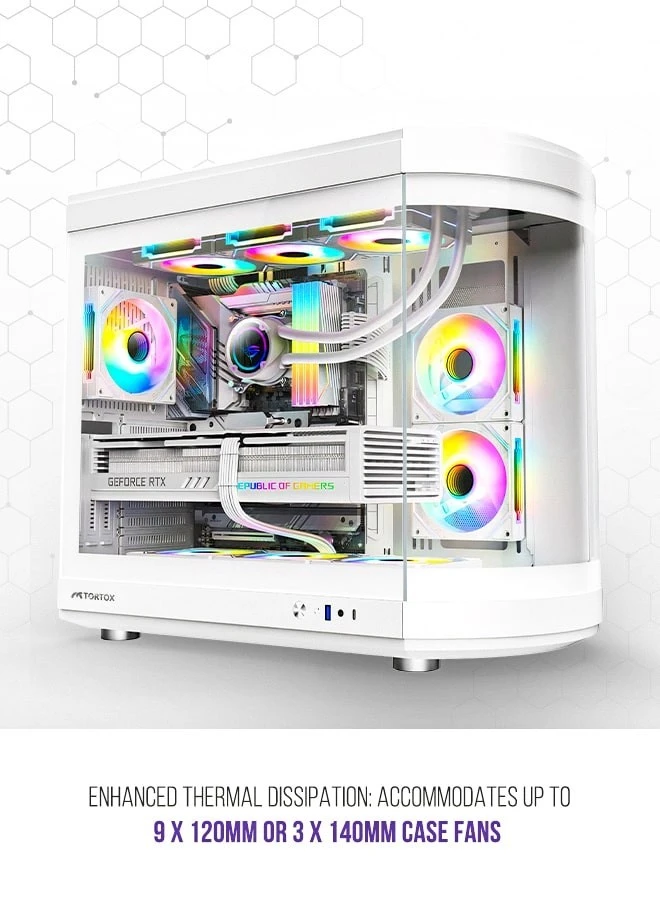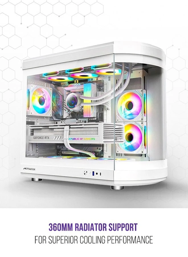 Experience the ultimate in gaming immersion with the Tortox Vidrio Curved Tempered Glass ATX/M-ATX/MINI-ITX Gaming PC Case. This sleek and stylish case boasts a curved tempered glass panel that not only showcases your high-performance components but also provides excellent visibility and airflow. With six pre-installed ARGB PWM fans, your system will stay cool and look stunning with mesmerizing RGB lighting effects. The Type-C USB port offers convenient connectivity, while the support for up to a 360mm radiator ensures optimal cooling for even the most demanding setups. Designed with excellent air flow in mind, this computer cabinet allows for seamless heat dissipation, keeping your components running at peak performance. Crafted with premium materials and meticulous attention to detail, the Tortox Vidrio Curved Tempered Glass ATX/M-ATX/MINI-ITX Gaming PC Case is the perfect blend of form and function, elevating your gaming experience to new heights.