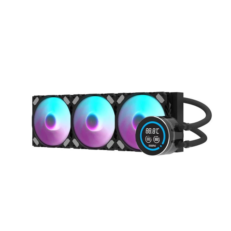 darkFlash DN360D Nebula is a high-performance 360mm AIO liquid CPU cooler featuring a vibrant 2.1″ LCD screen for real-time system monitoring, three 120mm ARGB fans delivering 61.7 CFM airflow, and hydraulic bearings for silent operation. The copper-base water block and three-stage motor pump ensure efficient cooling and longevity. Compatible with Intel and AMD platforms, it provides reliable thermal performance and customizable aesthetics for gaming and workstation builds