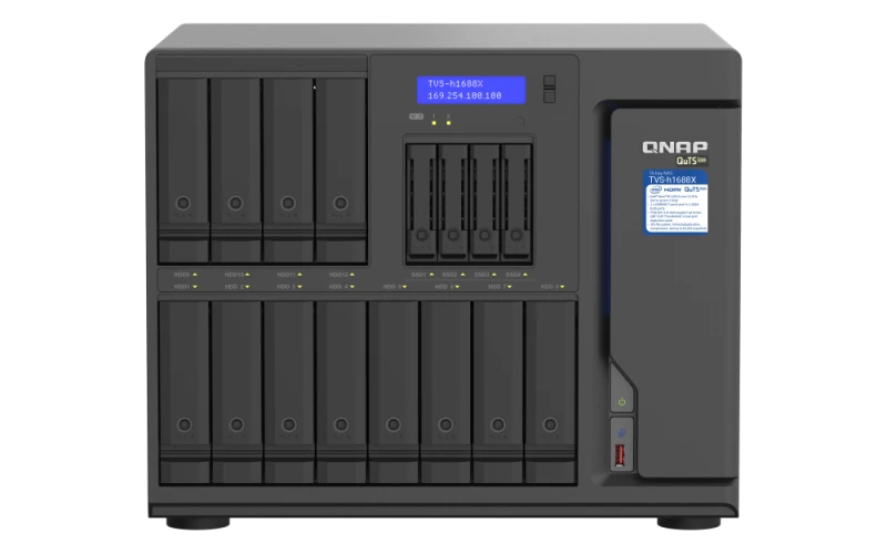 The TVS-h1688X comes with four 2.5-inch SATA 6Gb/s drive bays for SSDs and two M.2 NVMe Gen 3 x4 SSD slots that allow you to flexibly configure SSD caching to increase IOPS performance, reduce storage volume latency, and optimize 2.5GbE/10GbE performance. This is especially perfect for databases and virtual machine applications. With dedicated SSD bays/slots, the TVS-h1688X allows you to dedicate all of the 3.5-inch drive bays for high-capacity hard drives, ensuring both maximized storage capacity and performance.