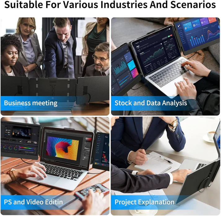 14-Inch HD Laptop Monitor Extender Display Excellence: 14-inch HD Display: Enjoy rich colors and a superior viewing experience with a 1000:1 contrast ratio and IPS 1080P resolution. Adjustable Parameters: Independently control brightness, contrast, and stereo speakers. Flexible Viewing: Rotate the screen up to 180 degrees to find the perfect angle anytime. Boost Productivity by 300%: Multi-Mode Support: Extended Mode, Duplicated Mode, and Second Screen Mode for enhanced multitasking and presentations. Ideal for Professionals: Perfect for gamers, programmers, financial professionals, designers, and anyone needing an efficient workflow. Wide Application Range: Easy Installation: Simply clamp the bracket to your 13.3"-17" laptop screen. Portable Design: Weighs only 3.57 lbs and comes with a complimentary handbag for easy transport, making it ideal for meetings, remote work, and travel. Plug and Play: No Driver Required: Connect with just two cables (full-featured USB-C and HDMI). Simple Setup: If "No Signal" appears, connect the HDMI cable for video signals. High Compatibility: Versatile Use: Compatible with Mac, PC, Windows, Android, PS5, Xbox, Switch, and most other operating systems. MacBook Note: Check our quick set up manual 1x S2 Portable Monitor 1x User Manual 1x Carry Bag 2x USB-C to USB-C Cable 2x HDMI to USB-C Cable 2x USB-A to USB-C Cable |