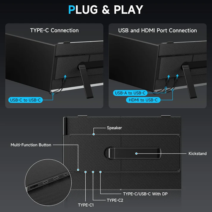 4. The screen comes with a full-featured TYPE-C * 2 + TYPE-C (USB-C with DP) interface external expansion,