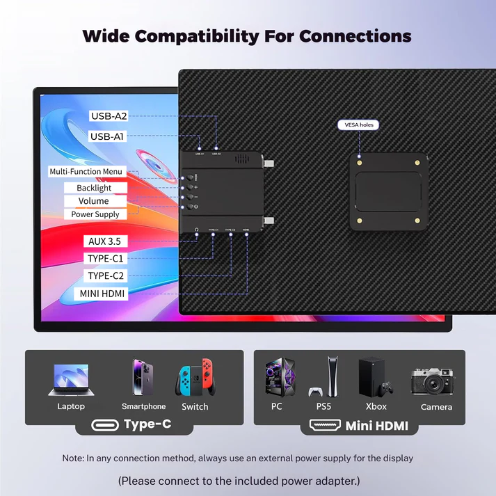 Brand: V2COM Model / MPN: D1 FHD Monitor Screen Size: 23.8″ Full HD (1920×1080) IPS panel Refresh Rate: 100 Hz Brightness: 300 nits Aspect Ratio: 16:9 Viewing Angles: 178° horizontal and vertical Input Ports: 2× USB‑C (full-function), 1× Mini HDMI, 2× USB‑A, 1× 3.5mm audio jack Power Source: USB‑C (PD supported) or USB‑A in HDMI mode Speakers: Integrated stereo speakers Compatibility: Windows, macOS, Android, Linux, ChromeOS, gaming consoles (PS5, Switch) Ergonomic Design: Height adjustment 0–145 mm, tilt up to 75°, rotated display 0–360° Power Consumption: ≤ 20 W Dimensions (folded): Approximately 61.2 × 32.7 × 3.3 cm Weight: Approx. 2.7 kg Build Material: PC + ABS + aluminum alloy Warranty & Support: 2‑year UAE local warranty, support services available |
