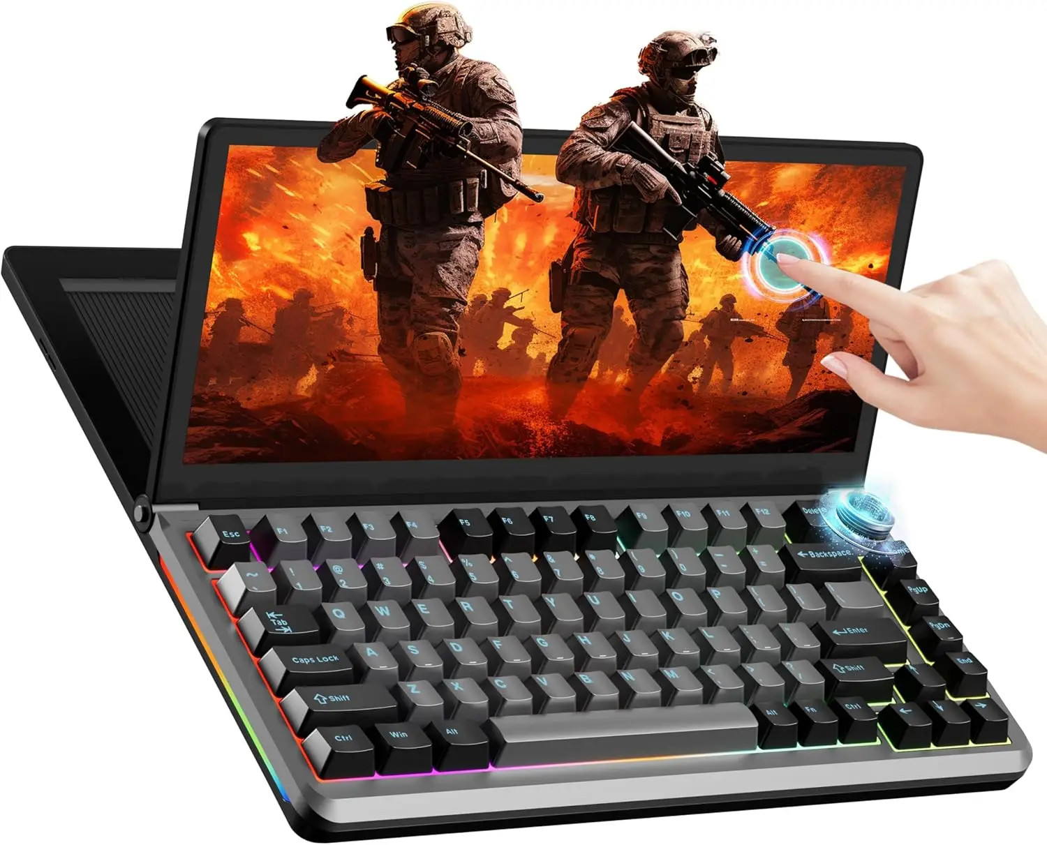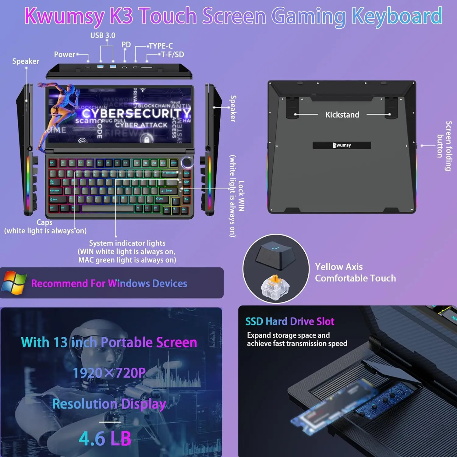 V2COM K3 combines a foldable 13″ Full HD touchscreen (1920×720) with an 82-key mechanical keyboard, offering 10-point touch control, RGB backlighting, and hot‑swappable Gateron Yellow switches. It supports plug‑and‑play via full‑function USB‑C or HDMI + USB‑A, includes M.2 SSD, TF/SD expansion, and USB‑A/USB‑C ports. Compatible with Windows, Linux, Android (limited Mac support), and consoles. With aluminum alloy frame, ergonomic foldable viewing (0–90°), 300 nits brightness, and dual speakers, it’s perfect for remote work, gaming, content creation, and mobile studio setups.