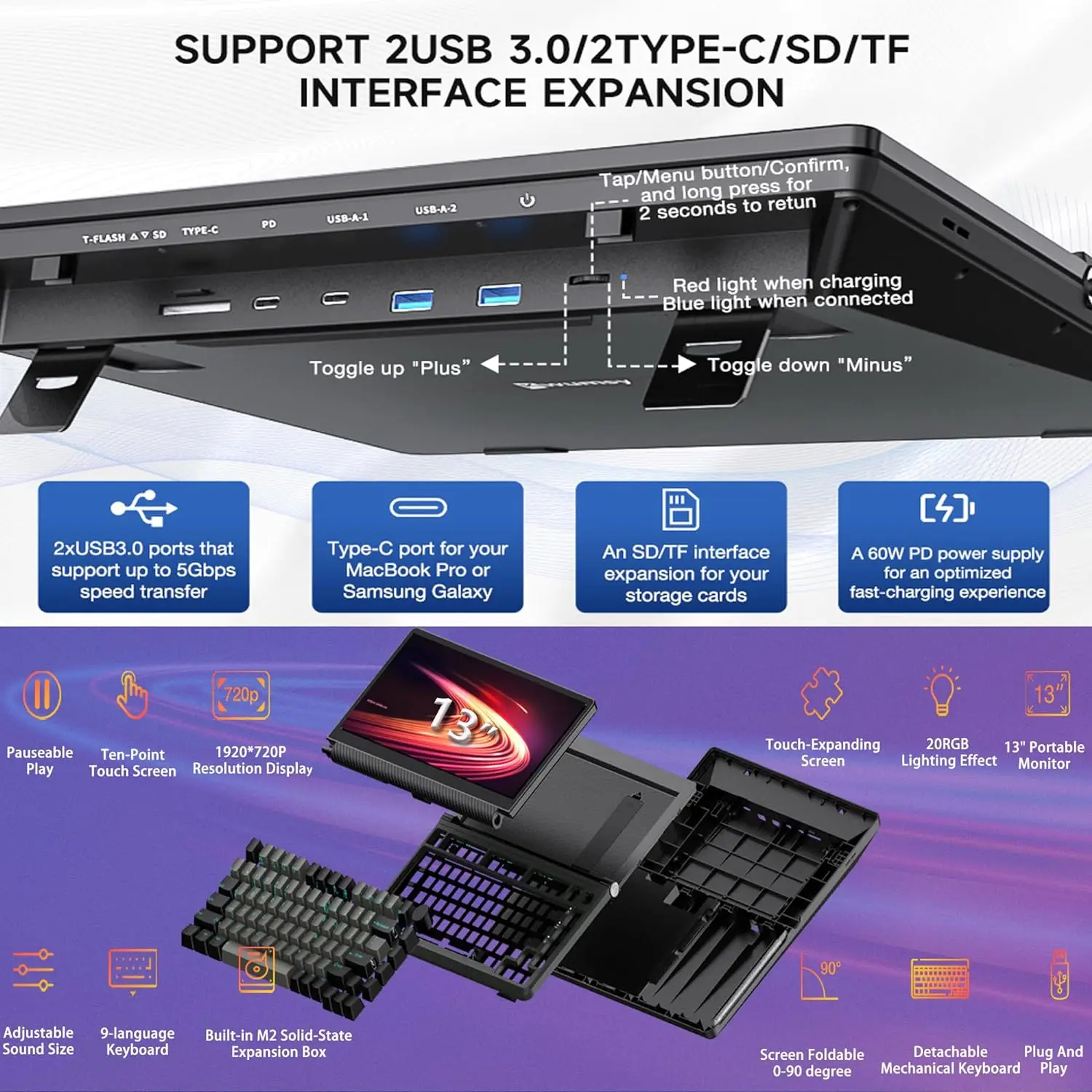 Overview: Upgrade your gaming setup with our 13-inch Touchscreen Gaming Mechanical Keyboard. This versatile device combines a keyboard and a touchscreen monitor, delivering an integrated experience perfect for multi-screen display work, keyboard input, HUB expansion, and M2 SSD interface expansion.