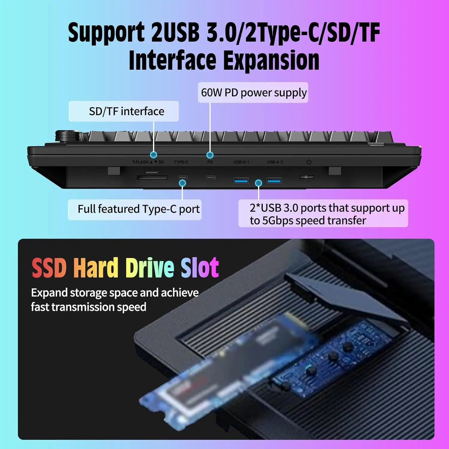 Multiple Ports: Equipped with 2 Type-C, 2 USB3.0, TF/SD, M2 B&M key, and B key interfaces.
