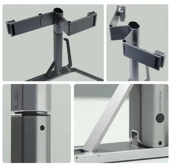 And when in use, the damping characteristics can be used to hover at any height. The entire bracket is made of pressure-resistant and super-light metal materials. The nitrogen lifting device is sealed inside the bracket and reaches a critical equilibrium state, which ensures the stable lifting of the two screens. This design enhances the stability and durability of the bracket.
