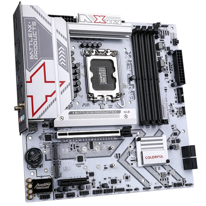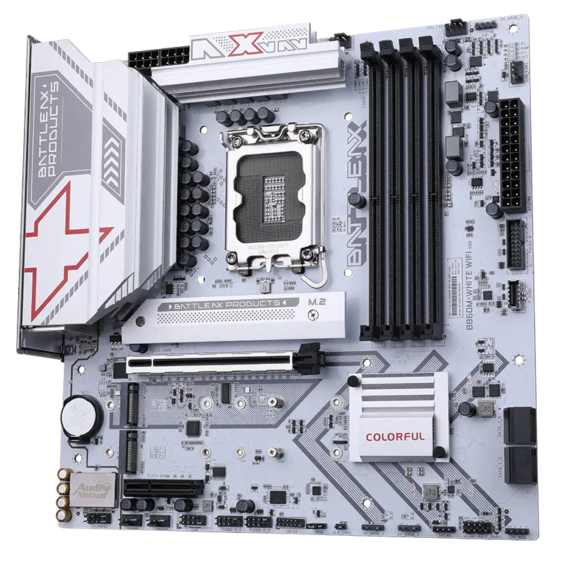 Model BATTLE-AX B860M-WHITE WIFI V20 Product Series BATTLE-AX Series Chipset Intel B860 Processor Supports Intel® Core™ Ultra processors that fit the LGA 1851 slot of the motherboard (*Please visit the Colorful official website www.colorful.cn for the latest processor support list) Memory 4 DDR5 memory slots, supporting up to 192 GB of memory (a single slot can support a capacity of up to 48 GB) - Support DDR5-7600(OC)/7400(OC)/7200(OC)/7000(OC)/6800(OC)/6600(OC)/6400/6200/6000/5800/5600/5400/5200/5000/4800MHz memory - Support Intel® Extreme Memory Profile (XMP) memory technology - Support dual channel memory technology (* Please visit www.colorful.cn for the latest memory compatibility list) SATA Ports 3 M.2 slots and 4 SATA 6Gb/s hard disk interfaces, Support the creation of RAID 0, RAID 1, RAID 5, and RAID 10 disk arrays using SATA hard disk devices - M.2_1 slot: support 2242/2260/2280 M.2 SSD (PCIe 5.0 x4, CPU channel) - M.2_2 slot: support 2242/2260/2280/22110 M.2 SSD (PCIe 4.0 x4, PCH channel) - M.2_3 slot: support 2242/2260/2280/22110 M.2 SSD (PCIe 4.0 x4, PCH channel) Board I/O Rear I/O: - 2×USB 2.0 interfaces - 4×USB 3.2 Gen 1 5Gbps Type-A interfaces - 1×USB 3.2 Gen 1 5Gbps Type-C interface - 1×USB 3.2 Gen 2x2 20Gbps Type-C interface - 1×DP 1.4 interface, Supports up to 8K 60Hz resolution - 1×HDMI 2.0 interface, Supports up to 4K 60Hz resolution - 1×2.5G network interface - 2×Wi-Fi 6 antenna interfaces - 3×Audio interfaces On board: - 2×USB 2.0 pins can expand 4 USB 2.0 Type-A interfaces - 1×USB 3.2 Gen 1 pin can expand 2 USB 3.2 Gen 1 5Gbps Type-A interfaces - 1×USB 3.2 Gen 2 Type-C slot can expand 1 USB 3.2 Gen 2 10Gbps Type-C interface - 1×CPU fan pin - 3×System fan pins - 1×Water cooling pump pin - 3×5V 3-pin ARGB pins - 1×12V 4-pin RGB pin - 1×Front audio pin - 1×Front panel pin - 1×Speaker pin - 1×COM port pin - 1×Clear CMOS jumper - 1×BIOS burner pin - 1×RGB light effect control jumper Expansion Slots 1×PCIe 5.0 x16 slot 1×PCIe 4.0 x4 slot BIOS 128M UEFI, support multiple languages Power Management Support S3/S4 wake-up, network S5 wake-up, support USB wake-up, support timing boot, call boot Hardware Monitor CPU fan speed is controllable, system fan speed is controllable (Fan1 supports independent control and Fan2 and Fan3 share control), CPU temperature monitoring, system temperature monitoring, and each group of voltage monitoring LAN RTL8125BG 2.5Gbit LAN, AX101 WiFi 6 wireless network card, Bluetooth 5.2 Audio Realtek ALC897 high fidelity decoding chip, Support up to 5.1 channels Configuration M-ATX 245 x 245 mm |